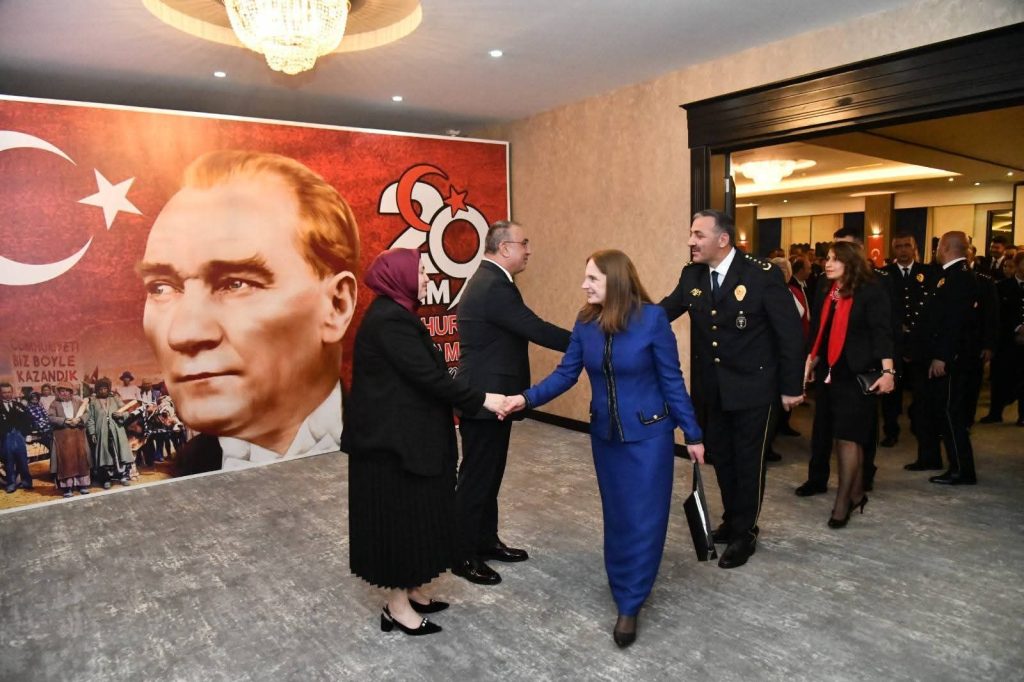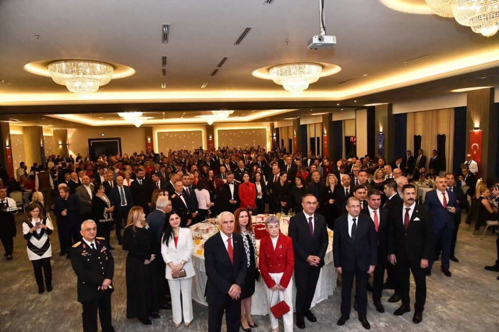 Türk Bayrağı temalı görsellerle süslenen salonda, Cumhuriyet’in kazanımlarına vurgu yapan film gösterimi ve müzik dinletisi büyük beğeni topladı. Katılımcılar, Cumhuriyet’in kurucusu Gazi Mustafa Kemal Atatürk ve silah arkadaşlarını saygı ve minnetle andı.