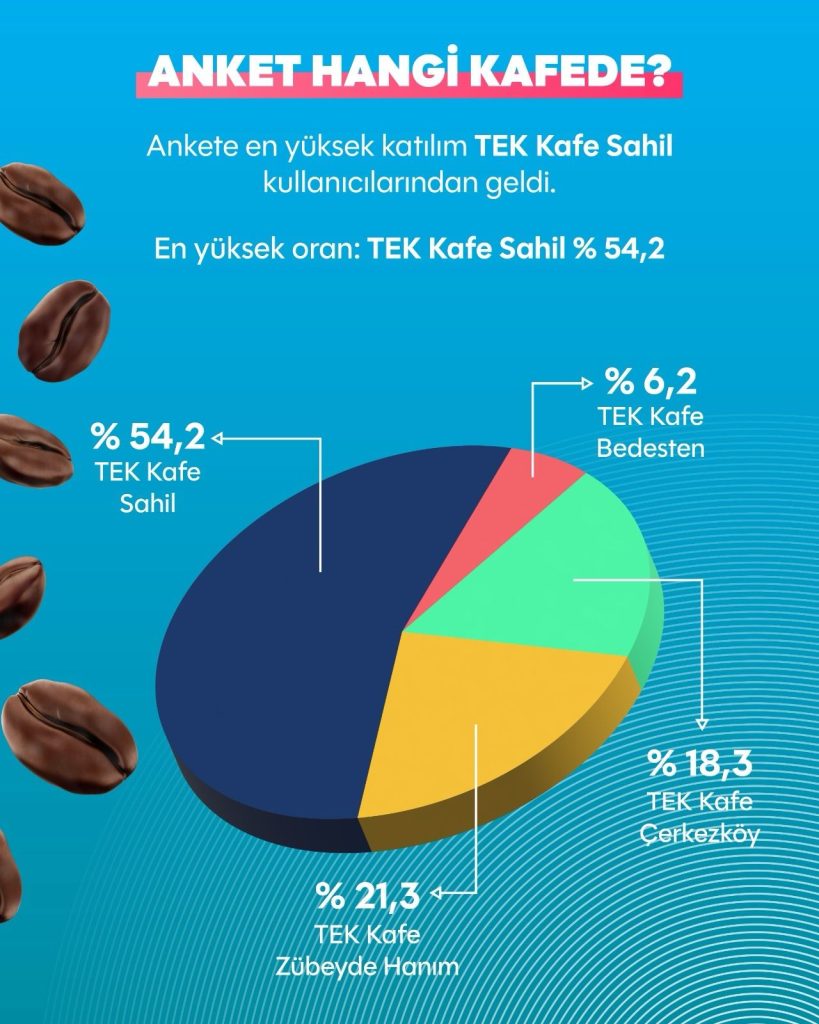 Ankete katılanların yüzde 54,2’si Tek Kafe Sahil, yüzde 21,3’ü Tek Kafe Zübeyde, yüzde 18,3’ü Tek Kafe Çerkezköy ve yüzde 6,2’si Tek Kafe Bedesten kullanıcılarından oluştu. Katılımcı profiline bakıldığında, Tek Kafe’nin düzenli bir kullanıcı kitlesi oluşturduğu da görüldü. Buna göre vatandaşların yüzde 37,3’ü haftada 1-2 kez, yüzde 30,7’si sürekli, yüzde 7,5’i haftada 3 ve üzeri sıklıkta Tek Kafe’yi ziyaret ettiğini ifade ederken, yüzde 24,4’ü ise ilk kez geldiğini belirtti.