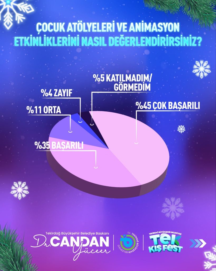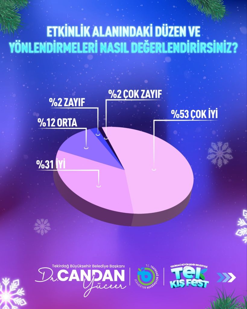 Tekirdağ Büyükşehir Belediyesi’nin kent kültürünü canlandırmak ve kamusal alanları daha aktif hale getirmek amacıyla hayata geçirdiği TEK Kış Fest, kış mevsimine sıcak bir dokunuş yaptı. Yeni yıl temasıyla kurgulanan, çocuk atölyelerinden sahne performanslarına, hediyelik ürün stantlarından ikramlara kadar geniş bir yelpazede hizmet sunan festivalin “Vatandaş Memnuniyet Anketi” sonuçları açıklandı.