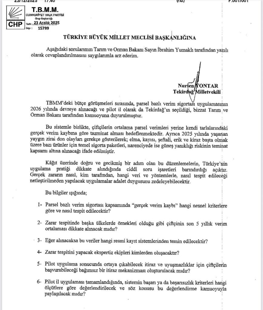 CHP Tekirdağ Milletvekili ve TBMM Katip Üyesi Nurten Yontar, parsel bazlı verim sigortası uygulamasına ilişkin Tarım ve Orman Bakanı İbrahim Yumaklı’nın yanıtlaması istemiyle Türkiye Büyük Millet Meclisi’ne yazılı soru önergesi verdi.